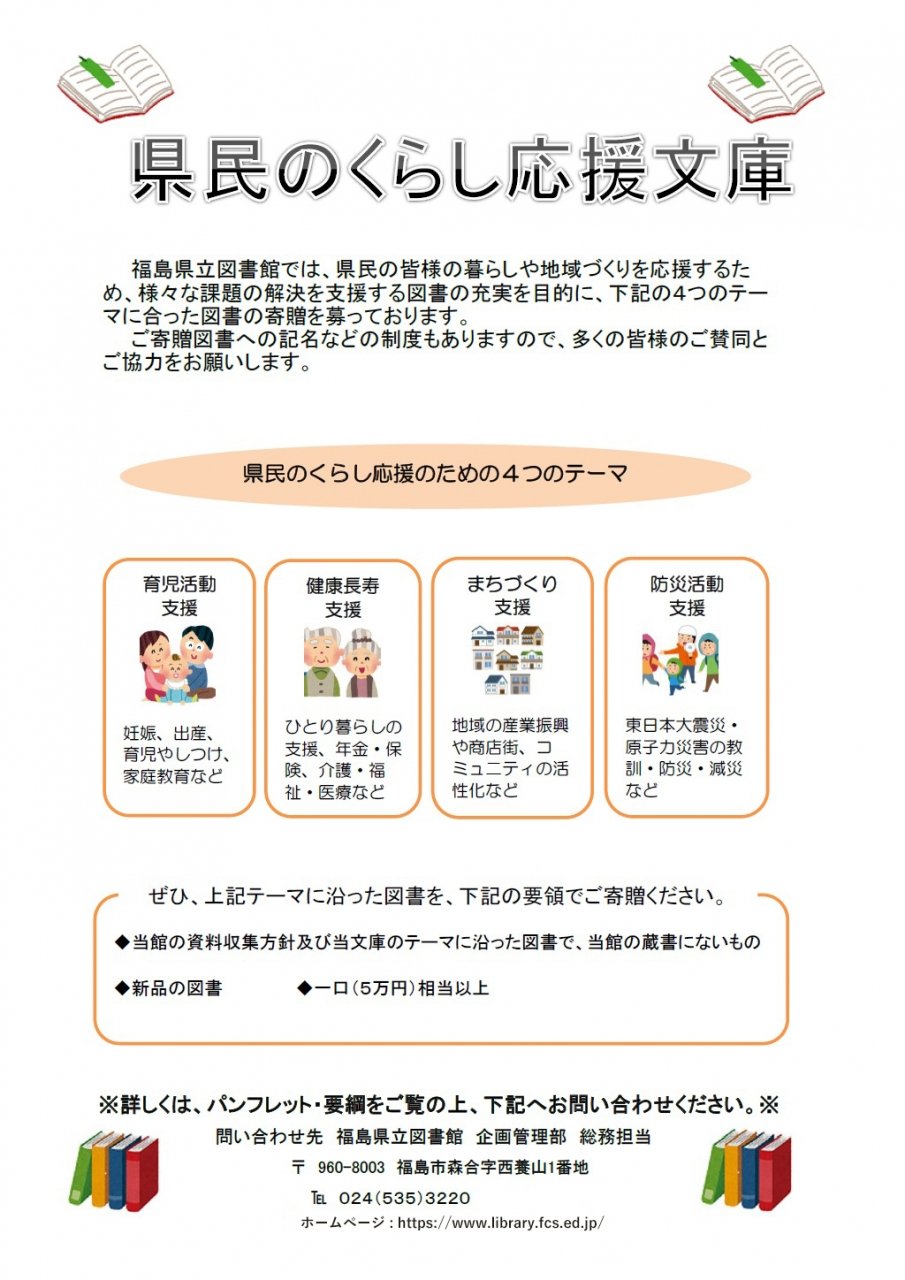 県民のくらし応援文庫 県民の皆様のくらしや地域づくりを応援するため、「育児活動支援」「健康長寿支援」「まちづくり支援」「防災活動支援」の4テーマで、図書を寄贈いただく制度です。 ご寄贈図書への記名などの制度もありますので、ぜひ多くの皆様のご賛同とご協力をお願いします。 『県民のくらし応援文庫』への寄贈のお願い(パンフレット)(PDF形式:303KB)「県民のくらし応援文庫設置要綱」(PDF形式:134KB) これまでご寄贈いただいた方々の紹介 令和7年度 令和6年度 令和5年度 令和4年度 令和3年度 令和2年度 令和元年度 平成30年度 平成29年度 平成28年度